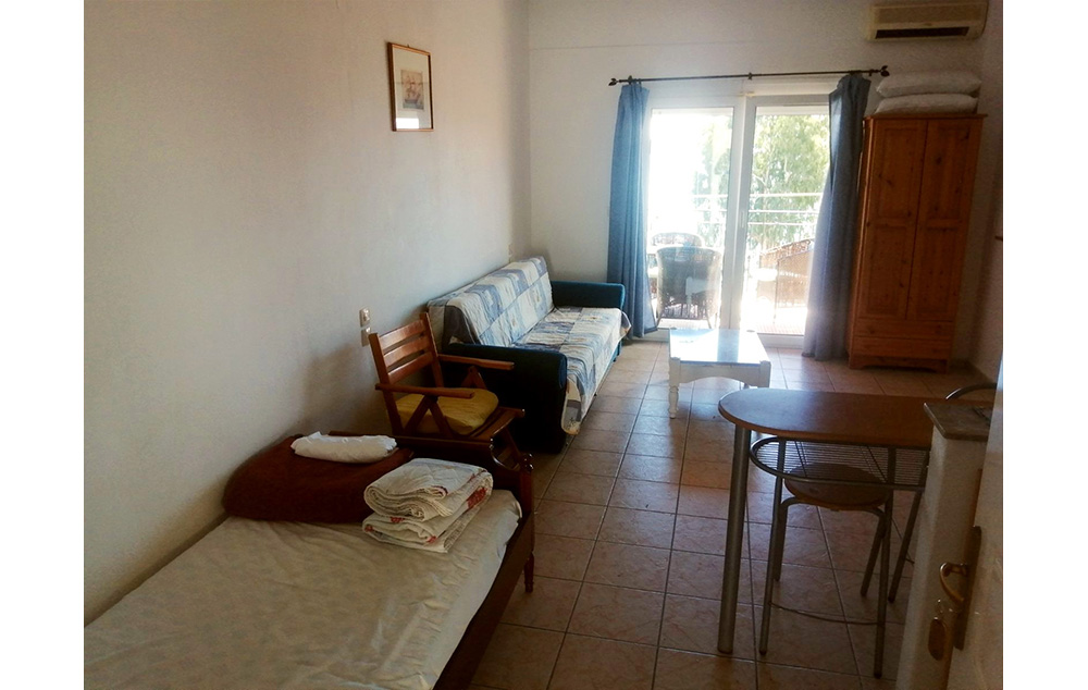Vila Noula se nalazi u lepom mediteranskom vrtu, na idealnoj lokaciji, oko jedan kilometar od centra grada, pored plaže Megali Amos (Velika plaža). Od kraja Megali Amos plaže (jedne od najlepših na ostrvu) deli je samo bašta – dvorište i glavni put. Do centralnog dela ove prelepe plaže je oko 250 metara. Studiji vile Noula su smešteni na prvom spratu, a apartmani na drugom i svi su sa pogledom na dvorište, more i plažu, opremljeni klima uredjajem (uz doplatu na licu mesta (opcija), 8 eur dnevno po studiju/apartmanu) i wi – fi Internetom i TV – om. Dvokrevetni i trokrevetni studiji sadrže opremljenu malu kuhinju sa delom za spavanje sa dva, odnosno tri standardna ležaja ili francuski i standardni, kupatilo i lepu terasu sa garniturom za sedenje. Veličina studija je cca 18 – 20 kvm + terasa. Četvorokrevetni apartman se sastoji od prostorije – sobe, u kojoj se nalazi mala kuhinja i dva ležaja (standardni i sofa na kojoj moze spavati odrasla osoba), spavaće sobe sa dva standardna ležaja, kupatila (ulaz iz spavaće sobe) i velike terase sa garniturom za sedenje i pogledom na more. Veličina apartmana je cca 28 kvm + terase. Vila Noula je B kategorije, ima peškire i mogućnost sopstvenog parkinga za ograničen broj vozila. Najbliži mini market je udaljen oko 250 metara, a restoran oko 650 metara. Vila je idealna za mlade zbog blizine grada, ali i za porodice, jer je plaža u neposrednoj blizini, a veliki vrt i dvorište na raspolaganju deci. Kuhinje u studijima i apartmanima su odgovarajuće za pripremanje manje komplikovanih obroka, pogodne za tzv. “light cooking, snekove, testenine…”.