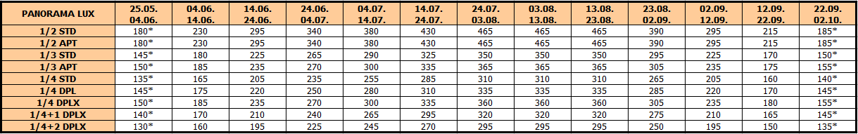 Panorama lux: Raspolaže studijima, apartmanima i dupleks apartmanima, namenjenim za smeštaj od dve do šest osoba, koji se nalaze na visokom prizemlju, prvom ili drugom spratu. Sve smeštajne jedinice su renovirane za sezonu 2025. i većina ima pogled na more.