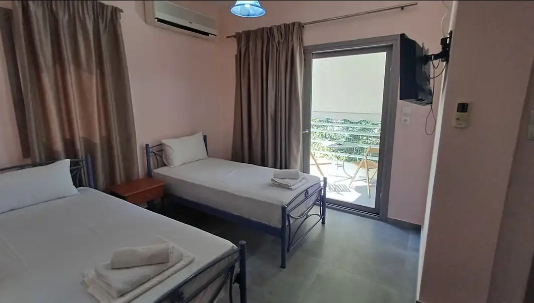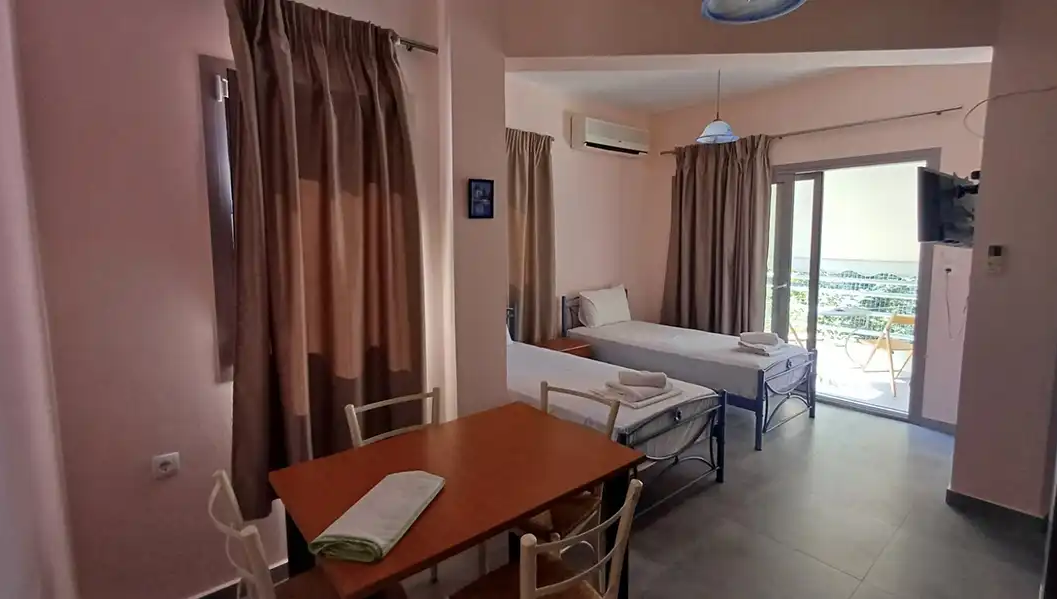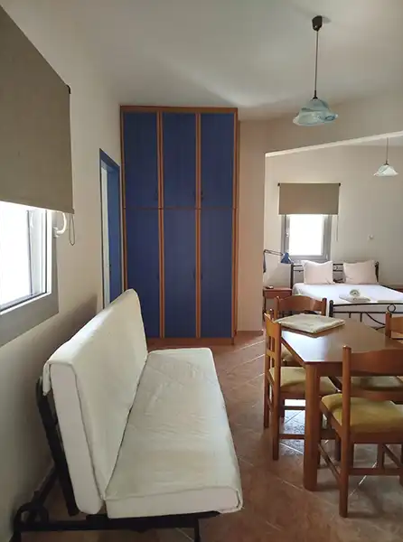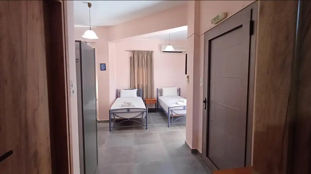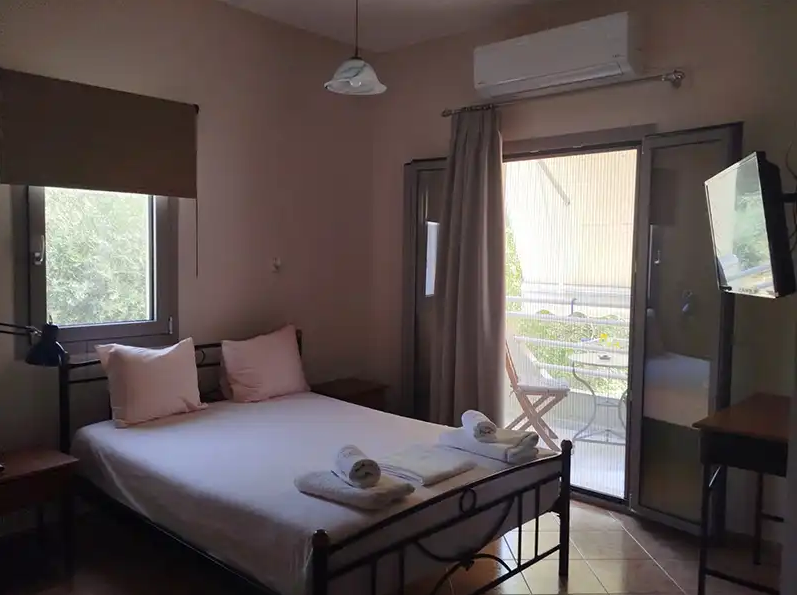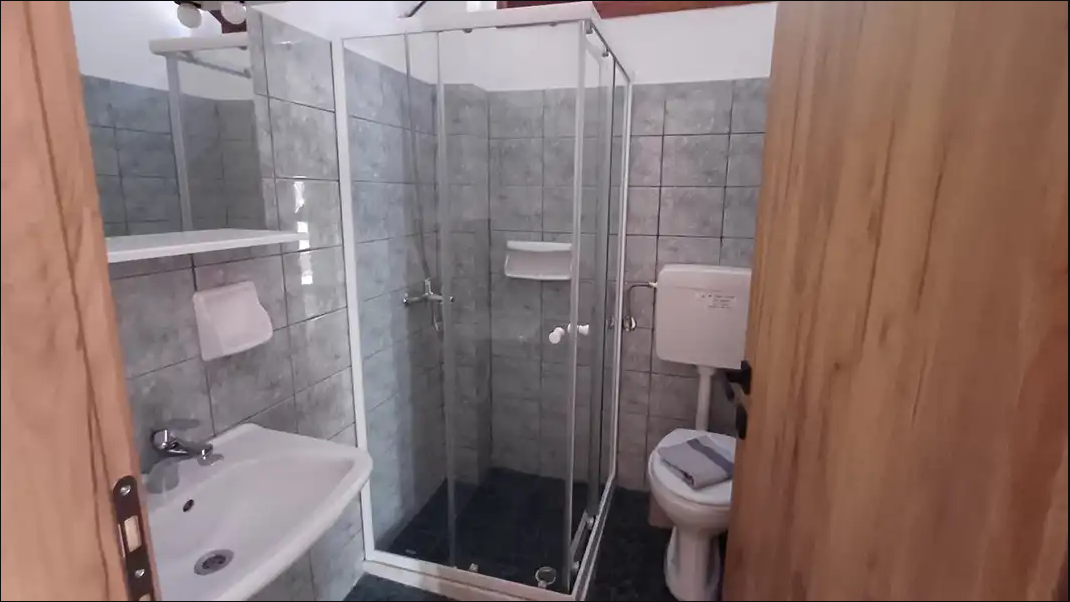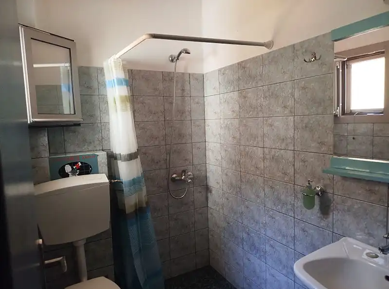 SMEŠTAJ: apartmani 1/4 imaju francuski krevet za maksimalno dve odrasle osobe, jedan ili dva singl kreveta, za maksimalno jednu ili dve odrasle osobe i pomoćni krevet za decu ili odraslu osobu. Takođe raspolaže dečijim krevetićem (na upit, za dete do 3 godine). Sadrže kuhinju opremljenu osnovnim posuđem za pripremu laganih obroka (nije dozvoljena priprema ribe), twc, TV, klima uređaj (uz doplatu 5 eura dnevno) i terasu sa pogledom na dvorište.