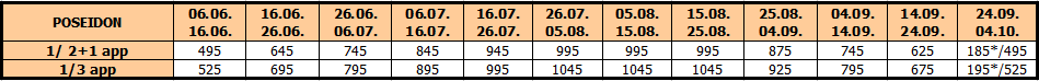 -Kod prodaje duple smene – prva smena gde je cena sa zvezdicom (*) i narednog termina, putnik plaća paket po osobi plus najam apartmana u sledećoj smeni. Isto važi i za poslednju smenu sa zvezdicom (*).
