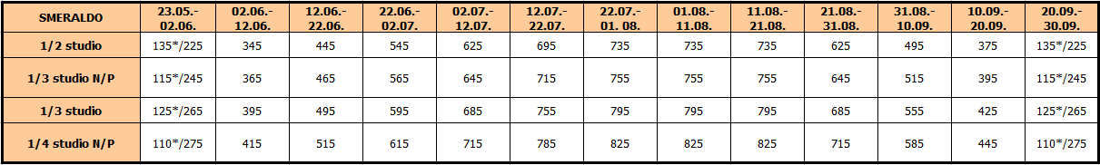 Cene su izražene u eurima po studiju/apartmanu na bazi najma za 10 noćenja