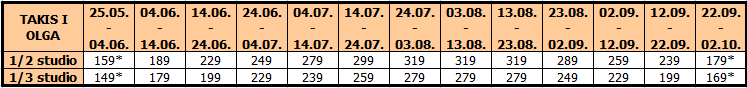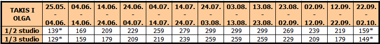 Vila TAKIS I OLGA: Udaljena je 30m od plaže. Dvorište vile je prostrano sa puno zelenila i hladovine. Vila Takis i Olga raspolaže standardno opremljenim dvokrevetnim i trokrevetnim studijima za smeštaj 2-4 osobe. Svaka smeštajna jedinica poseduje opremljenu čajnu kuhinju, kupatilo, tv, balkon i klima uređaj (upotreba klima uređaja je uključena u cenu aranžmana za smene u julu i avgustu). Smeštajne jedinice se nalaze na prvom i drugom spratu. Korišćenje klima uređaja je uključeno u cenu u julu i avgustu. U ostalim terminima doplata za korišćenje klima uređaja iznosi 5 eura dnevno po studiju.
