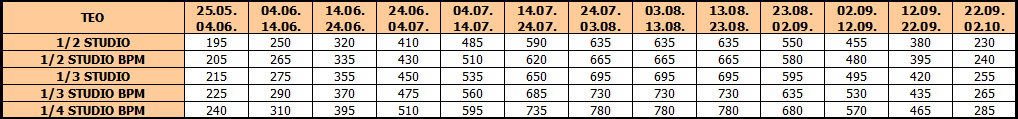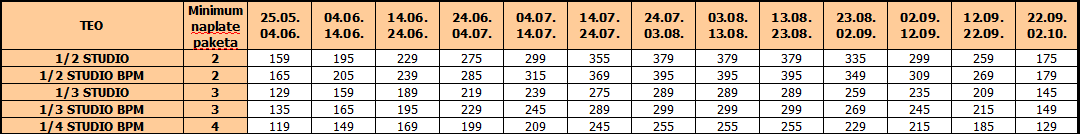 Cene u tabeli su izražene na bazi najma po studiju/apartmanu za 10 noćenja.