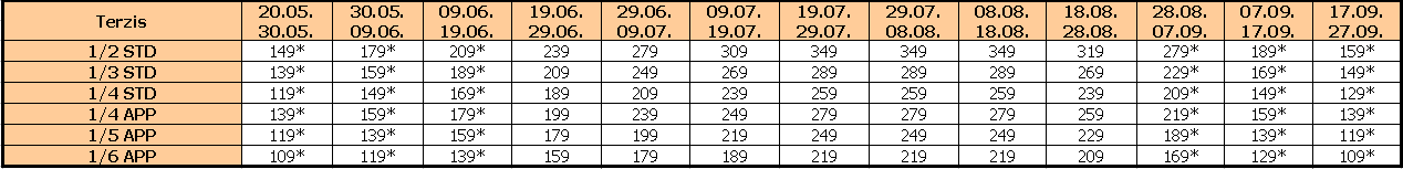 Za sopstveni prevoz cena aranžmana se umanjuje za 30€ po osobi, a 20€ za smene označene ZVEZDICOM (*)