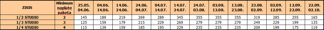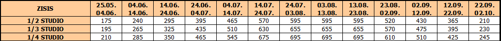 Cene u tabeli su izražene na bazi najma po studiju/apartmanu za 10 noćenja.