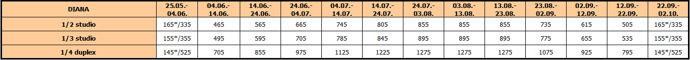 Cene su izražene u eurima po studiju/apartmanu na bazi najma za 10 noćenja