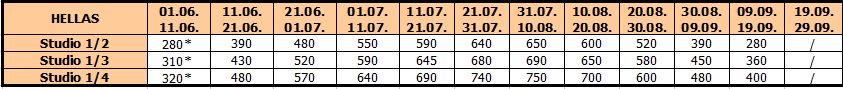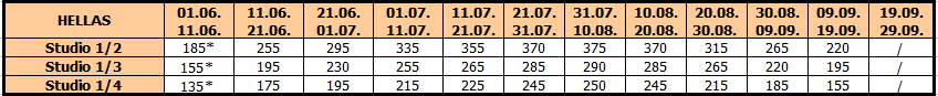 Cene su izražene u eurima po studiju/apartmanu na bazi najma za 10 noćenja