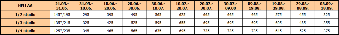 SMEŠTAJ: Hotel raspolaže 1/2,1/3 i 1/4 studijima, za dve, tri ili četiri odrasle osobe i jedno dete do 6 godina. Svi studiji sadrže opremljenu kuhinju za pripremu laganih obroka (nije dozvoljena priprema ribe), twc, klima uređaj (uz doplatu 7€ dnevno na licu mesta), TV, peškire, terasu. Promena posteljine i peškira je 6-tog dana u prepodnevnim časovima , gosti sami održavaju higijenu.