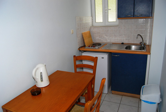 Apartman 02 i 03: apartmani se sastoje od prostrane sobe sa dva ili tri odvojena kreveta, izdvojenom prostranom kuhinjom (frižider, ugradni šporet sa dve ringle, električni bokal, posuđe za odgovarajući broj osoba), klimom, TV-om. Kupatilo – tuš/wc sa peškirima. Prostrana terasa sa garniturom za sedenje.