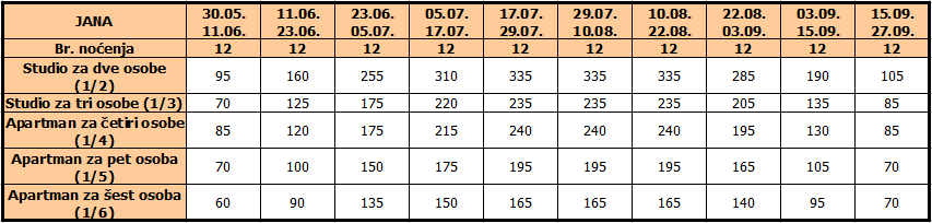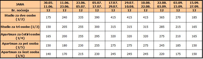 • Ukoliko dete do 12 godina koristi vlastiti ležaj, plaća cenu iz tabele umanjenu za 20€