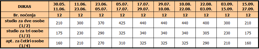 • Ukoliko dete do 12 godina koristi vlastiti ležaj, plaća cenu iz tabele umanjenu za 20€