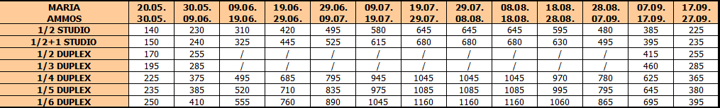Cene u tabeli su izražene na bazi najma po studiju/apartmanu za 10 noćenja.