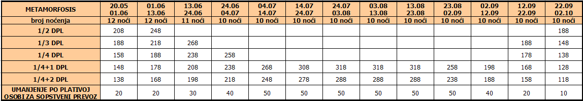 Cene iz tabele predstavljaju cenu paket aranžmana (smeštaj + prevoz) po osobi.