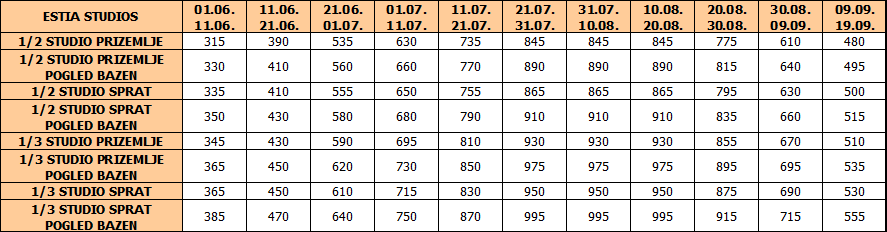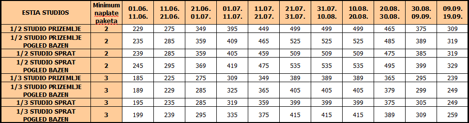 Cene u tabeli su izražene na bazi najma po studiju/apartmanu za 10 noćenja.