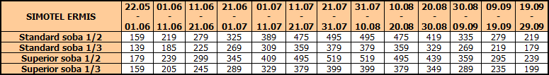 Cene su izražene u evrima po osobi, smeštaj 10 noćenja (usluga noćenje sa doručkom)