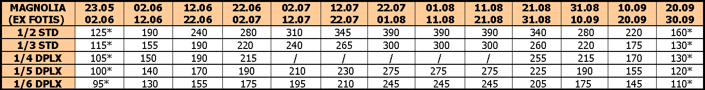 – U slučaju spajanju smena, cena se umanjuje za 30€ po osobi na ukupnu cenu paket aranžmana, osim u smenama označenim zvezdicom.