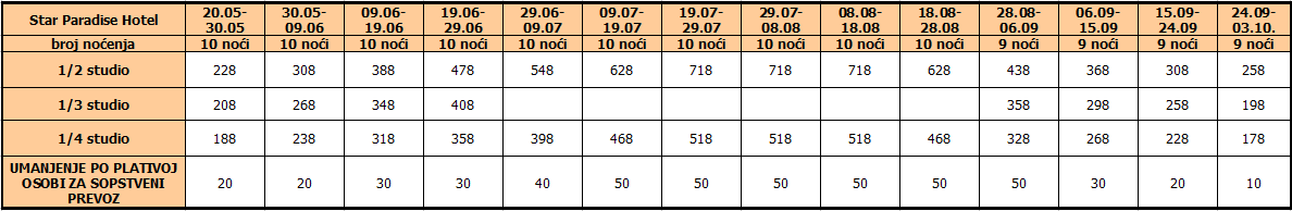 Cene iz tabele predstavljaju cenu paket aranžmana (smeštaj + prevoz) po osobi.