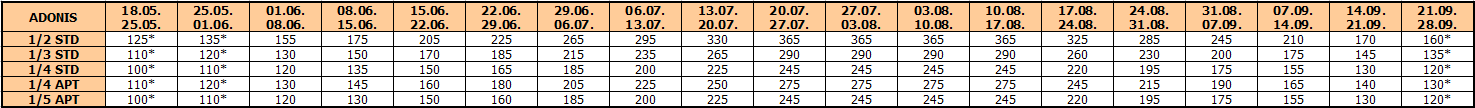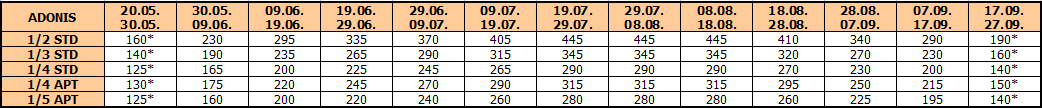 Za sopstveni prevoz cena aranžmana se umanjuje za 30€ po osobi, a 20€ za smene označene ZVEZDICOM (*)