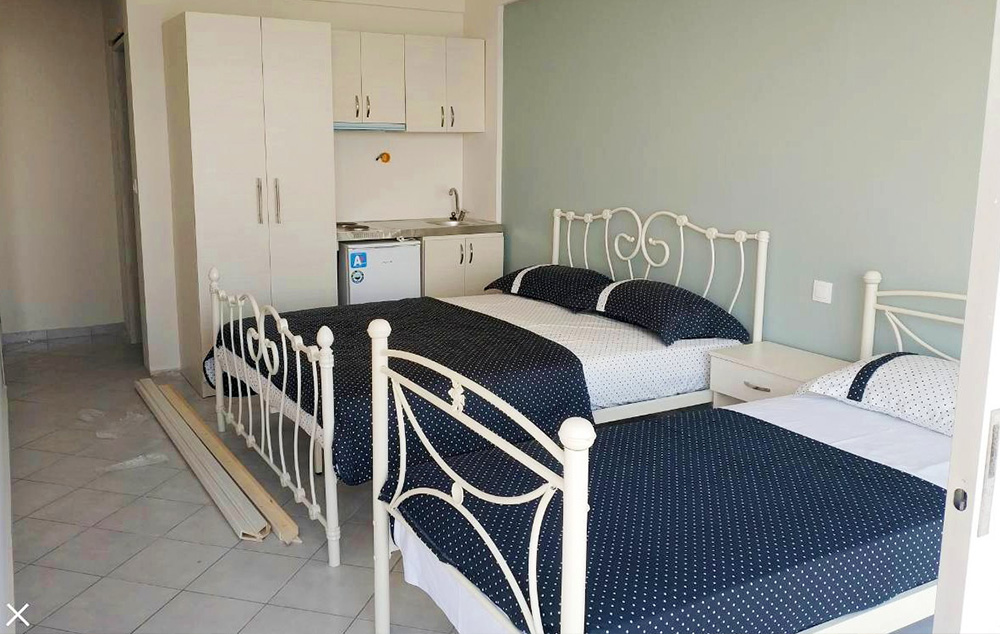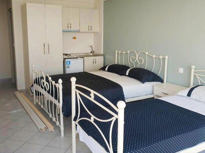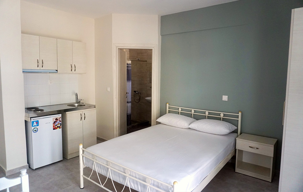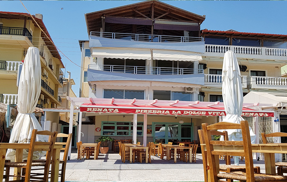 Izvanredna vila Afroditi, nalazi se na samoj obali, plaži i šetalištu Olympic Beach-a. Vila poseduje lift i sastoji od nedavno, potpuno renoviranih, lepih studija na prvom i drugom spratu. Deo studija je sa direktnim pogledom na more i plažu, Halkidiki i Athos od kojeg zastaje dah, a deo sa lepim pogledom pozadi na dvorište i okolne zgrade. Studiji su opremljeni klima uredjajem (uz doplatu na licu mesta (opcija), 5 eur dnevno po studiju), aspiratorom, wi – fi Internetom (uračunat u cenu) i TV-om. Lepi, ukusno dizajnirani i opremljeni dvokrevetni i trokrevetni studiji sadrže opremljeni kuhinjski deo, deo za spavanje sa francuskim i jednim standardnim ležajem, kupatilo i lepe velike natkrivene terase sa tendom i garniturom za sedenje. Veličina studija je cca 22 kvm + velika terasa. Zahvaljujući potpuno novim kupatilima, novom, izuzetno kvalitetnom nameštaju i opremi, vila Azzurro Mare je odlične A kategorije, nema peškire i nema sopstveni parking.