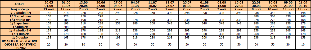 Cene iz tabele predstavljaju cenu paket aranžmana (smeštaj + prevoz) po osobi.