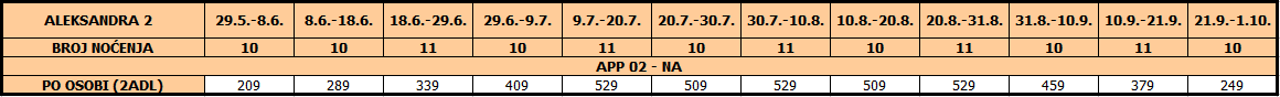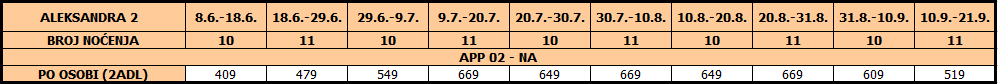 – usluge smeštaja (10/11 noćenja) na bazi najma studija / apartmana u izabranom terminu prema tabeli.