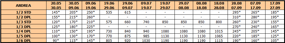 U smenama sa zvezdicom *, u slučaju sopstvenog prevoza cena paket aranžmana se umanjuje za 25€ po osobi.