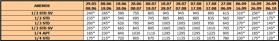 *Cene označene zvezdicom * su cene paket aranžmana u VANSEZONI (uračunat smeštaj i autobuski prevoz iz Niša, bez teritorijalne doplate za prevoz) po osobi.* Teritorijalna doplata za autobuski prevoz severno od Niša: Beograd – 10 evra, Novi Sad – 20 evra