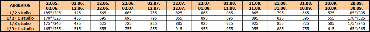 Cene su izražene u evrima po najmu studija/apartmana za 10 noćenja