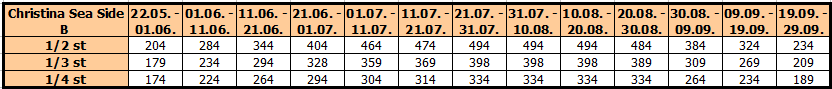 Christina Sea Side B je vila apartmanskog tipa. Nalazi se u mirnom delu Haniotija, 100 m od plaže. Vila raspolaže dvokrevetnim, trokrevetnim i četvorokrevetnim studijima, koji se nalaze na prizemlju, prvom i drugom spratu. U svakom studiju se nalazi LCD televizor, klima, kuhinja, terasa i kupatilo. Korišćenje klima uređaja i bežičnog interneta je uključeno u cenu. Posteljina i peškiri se menjaju jednom u toku smene. Objekat se nalazi na sjajnoj lokaciji u odnosu na plažu.