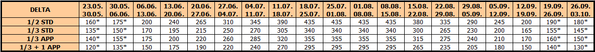-Cene sa zvezdicom (*) u prvoj i poslednjoj smeni označavaju paket aranžman (smeštaj+prevoz po osobi) i odnose se na polazak iz Beograda. Ne postoji umanjenje za polaske južnije od Beograda.