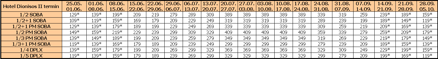 Za sopstveni prevoz cena aranžmana se umanjuje za 30€ po osobi, a 20€ za smene označene ZVEZDICOM (*)