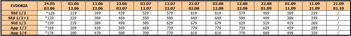 Popusti: Deca od 2 do 12 godina u sopstvenom ležaju ostvaruju popust od 15€ na cenu iz tabele i imaju svoje sedište u autobusu (odnosi se na polaske iz Novog Sada, Beograda do Aleksinca, Niša).