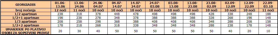 Cene iz tabele predstavljaju cenu paket aranžmana (smeštaj + prevoz) po osobi.