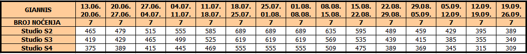 – za 1/1 sobu u privatnom smeštaju – 100 % od cene aranžmana iz tabele za 1/2 studio, u hotelima na upit