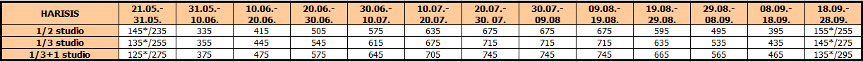 Cene su izražene u eurima po studiju/apartmanu na bazi najma za 10 noćenja