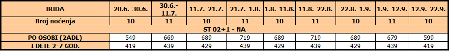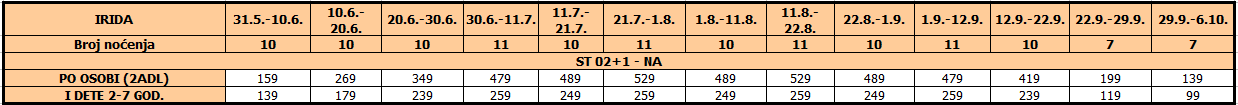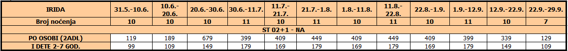 – usluge smeštaja (10/11 noćenja) na bazi najma studija / apartmana u izabranom terminu prema tabeli.