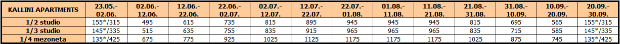 Cene su izražene u eurima po studiju/apartmanu na bazi najma za 10 noćenja