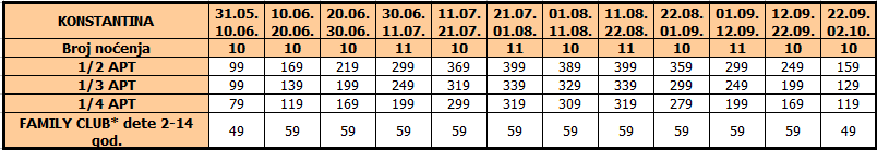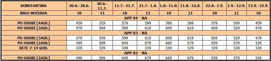 Cene su izražene u evrima po osobi na bazi najma za 10/11 noćenja