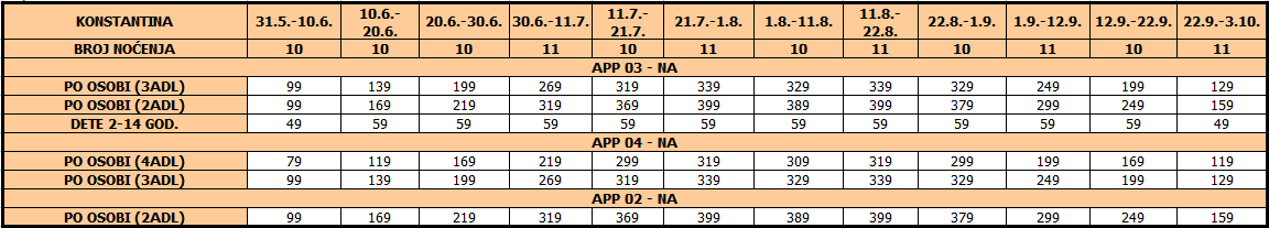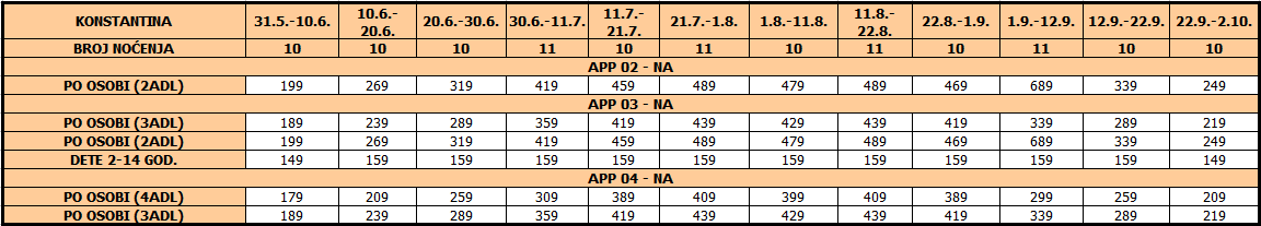 – usluge smeštaja (10/11 noćenja) na bazi najma studija / apartmana u izabranom terminu prema tabeli.