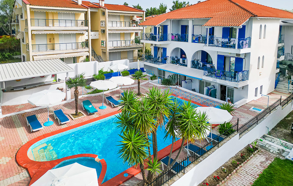 Lokacija: Ovaj hotel apartmanskog tipa se nalazi u mirnom delu mesta, udaljen je oko 300m od plaže i oko 450m od centra mesta Hanioti.