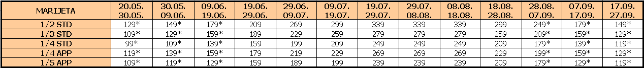 Za sopstveni prevoz cena aranžmana se umanjuje za 30€ po osobi, a 20€ za smene označene ZVEZDICOM (*)