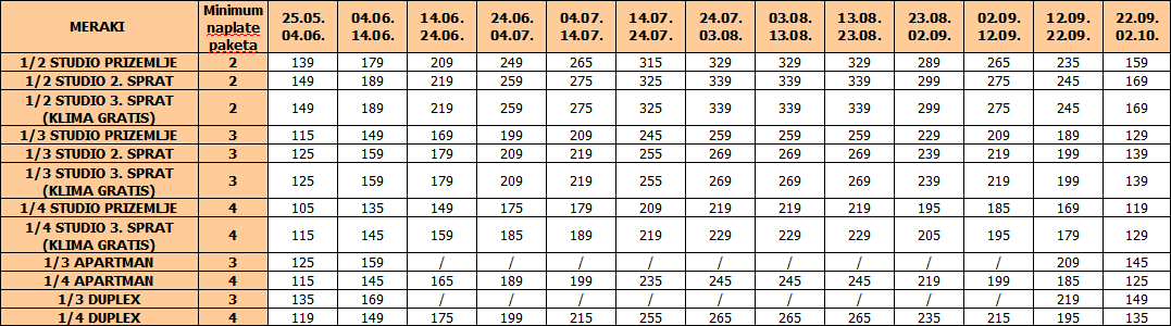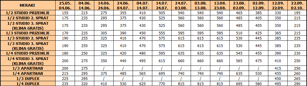 Cene u tabeli su izražene na bazi najma po studiju/apartmanu za 10 noćenja.