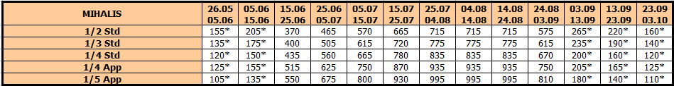 U smenama sa zvezdicom *, u slučaju sopstvenog prevoza cena paket aranžmana se umanjuje za 25€ po osobi.