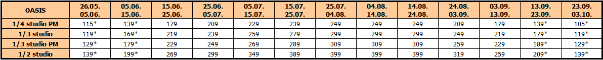 Cena aranžmana se umanjuje za 25€ po osobi, osim za predsezonu i postsezonu (smene označene *) gde se u slučaju korišćenja sopstvenog prevoza plaća puna cena paket aranžmana.