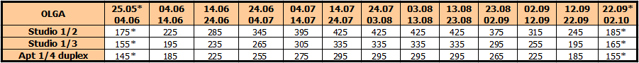 Cene su izražene u evrima po studiju / apartmanu, najam za 10 noćenja