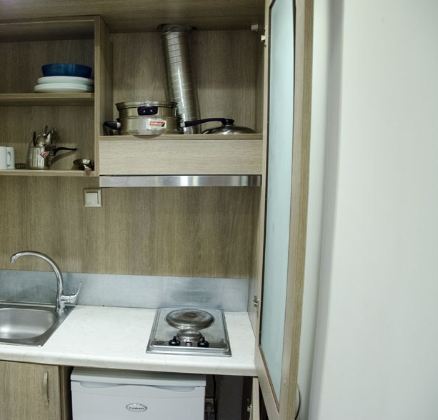 DVOKREVETNI STUDIO: Sastoji se od dva standard ležaja ili francuskog ležaja dimenzija (160X200cm), ormara, noćnog stočića sa ogledalom, TV/KAT, klima uređaja, jednog velikog i jednog malog peškira po osobi. Kuhinja je u potpunosti opremljena posuđem za dve osobe, aspiratorom, šporetom sa dve ringle i frižiderom. Kupatilo je sa tuš kabinom, fenom za kosu. Svaki studio poseduje terasu sa stolom i dve stolice.