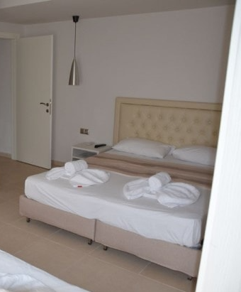 ČETVOROKREVETNI APARTMAN: Sastoji se od spavaće sobe u kojoj se nalaze dva standard ležaja ili francuski ležaj dimenzija (160X200cm), ormar, noćni stočić sa ogledalom, TV/KAT, klima uređaj i dnevnog boravka u kome su dva standardna ležaja dimenzija (80X200cm) ili ugaona garniture na razvlačenje, kao i kuhinja koja je u potpunosti opremljena posuđem za četiri osobe, aspiratorom, šporetom sa dve ringle i frižiderom. Svaki putnik dobija po jedan mali i jedan veliki peškir. Kupatilo je sa tuš kabinom, fenom za kosu. Svaki apartman poseduje terasu sa stolom i četiri stolice.