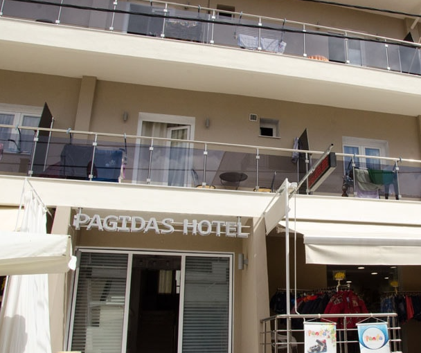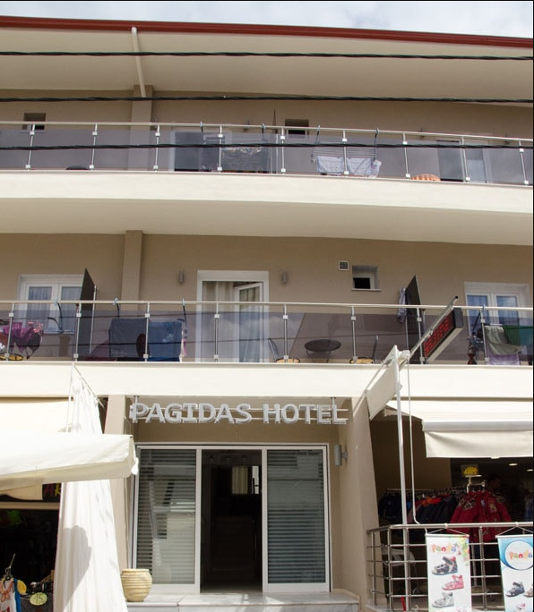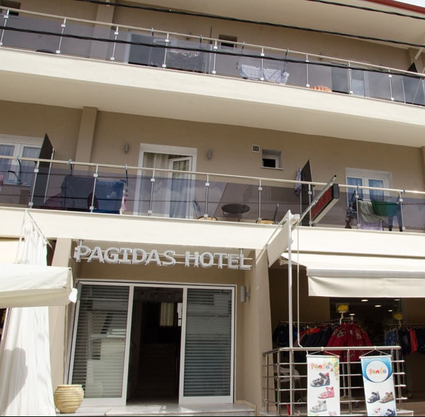 HOTEL APP PAGIDAS (ex Ahileas) se nalazi u centru letovališta Hanioti, na oko 50 metara od glavnog trga i na oko 230 metara od plaže. Ovaj hotel apartmanskog tipa je u potpunosti renoviran u maju 2014. godine i predstavlja jednu od lepših vila u Haniotiju. Sam objekat poseduje na svakom spratu prostor za odlaganje stvari pri dolasku/odlasku sa dva kauča gde naši putnici mogu provesti slobodno vreme na dan smene. Objekat se nalazi na šetalištu i u letnjoj sezoni ulica je zatvorena za vozila. Pored objekta je veliki broj butika, prodavnica suvenira, kafića i restorana. U neposrednoj blizini je i supermarket, kao i pekara. Sa zadnje strane hotela je i javni parking gde gosti mogu parkirati svoja vozila.