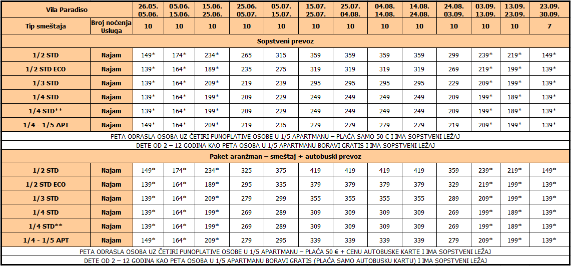 – Peta odrasla osoba u 1/5 apartmanu uz četiri punoplative osobe plaća 50 € i ima sopstveni ležaj – (sopstveni prevoz), odnosno na cenu od 50 € se dodaje cena karte – za autobuski prevoz;