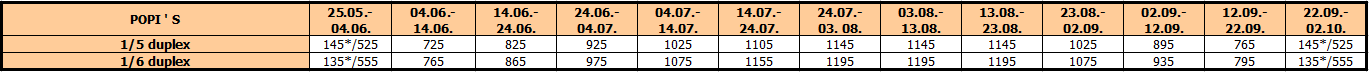 -Kod prodaje duple smene – prva smena gde je cena sa zvezdicom (*) i narednog termina, putnik plaća paket po osobi plus najam apartmana u sledećoj smeni. Isto važi i za poslednju smenu sa zvezdicom (*).